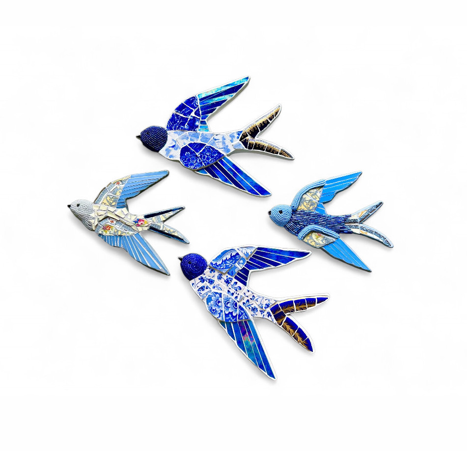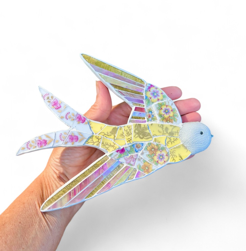 I started making these intricate and delicate mosaic beaded barn swallows in the summer of 2024 using vintage china, stained glass, mirror glass and Czech glass beads. More details and purchase info in my Etsy Shop below.