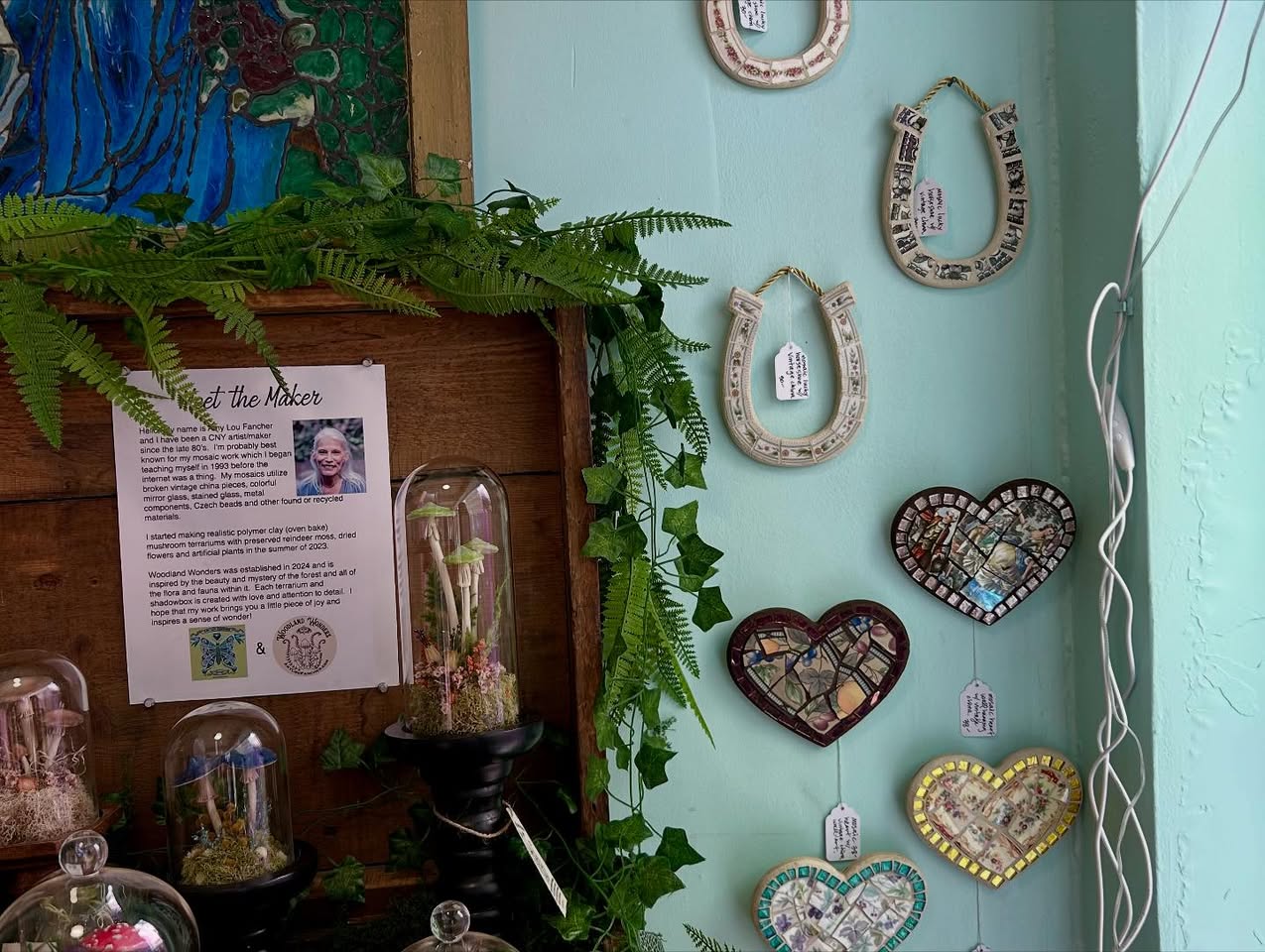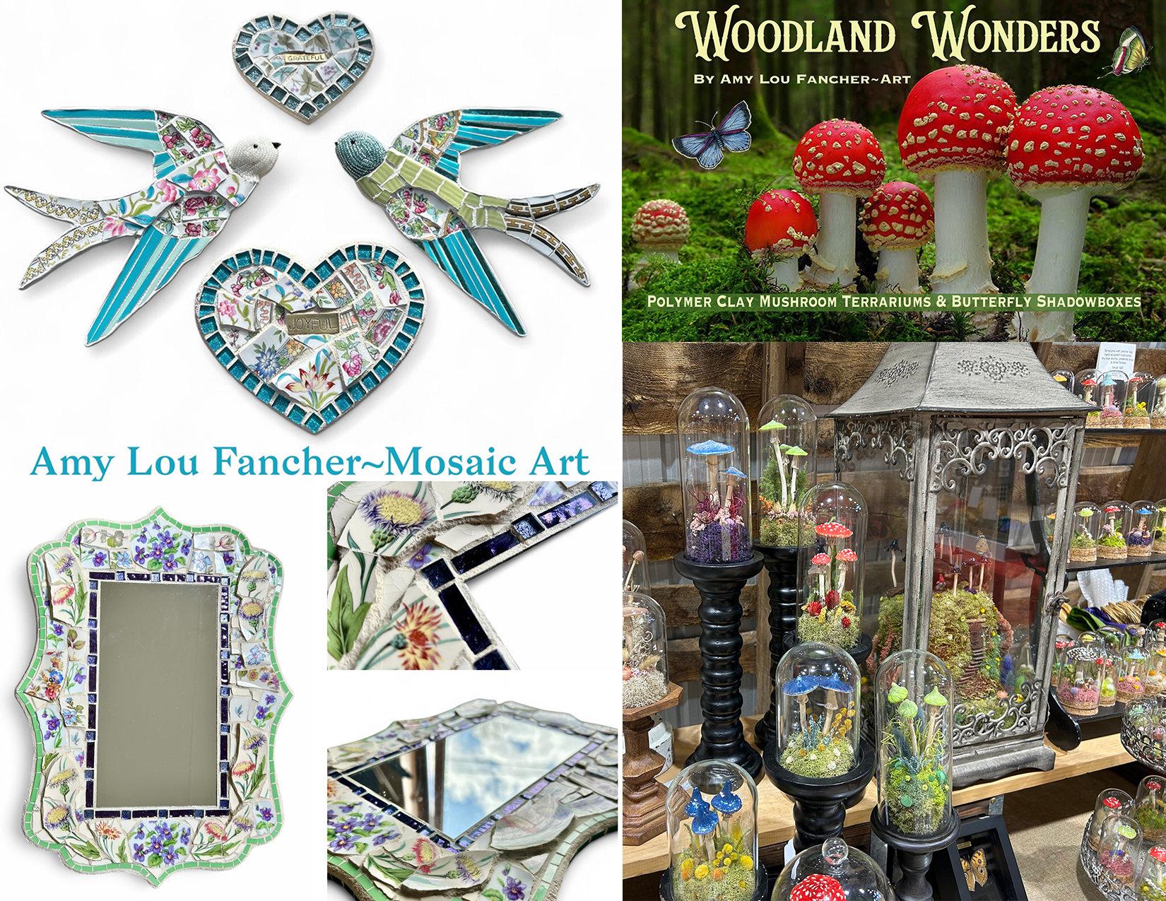 I have a wonderful dreamy display for my Woodland Wonders polymer clay mushroom terrariums thanks to the lovely shop owner, Linda Viertel. A selection of my smaller mosaic works and butterfly shadowboxes are also available.