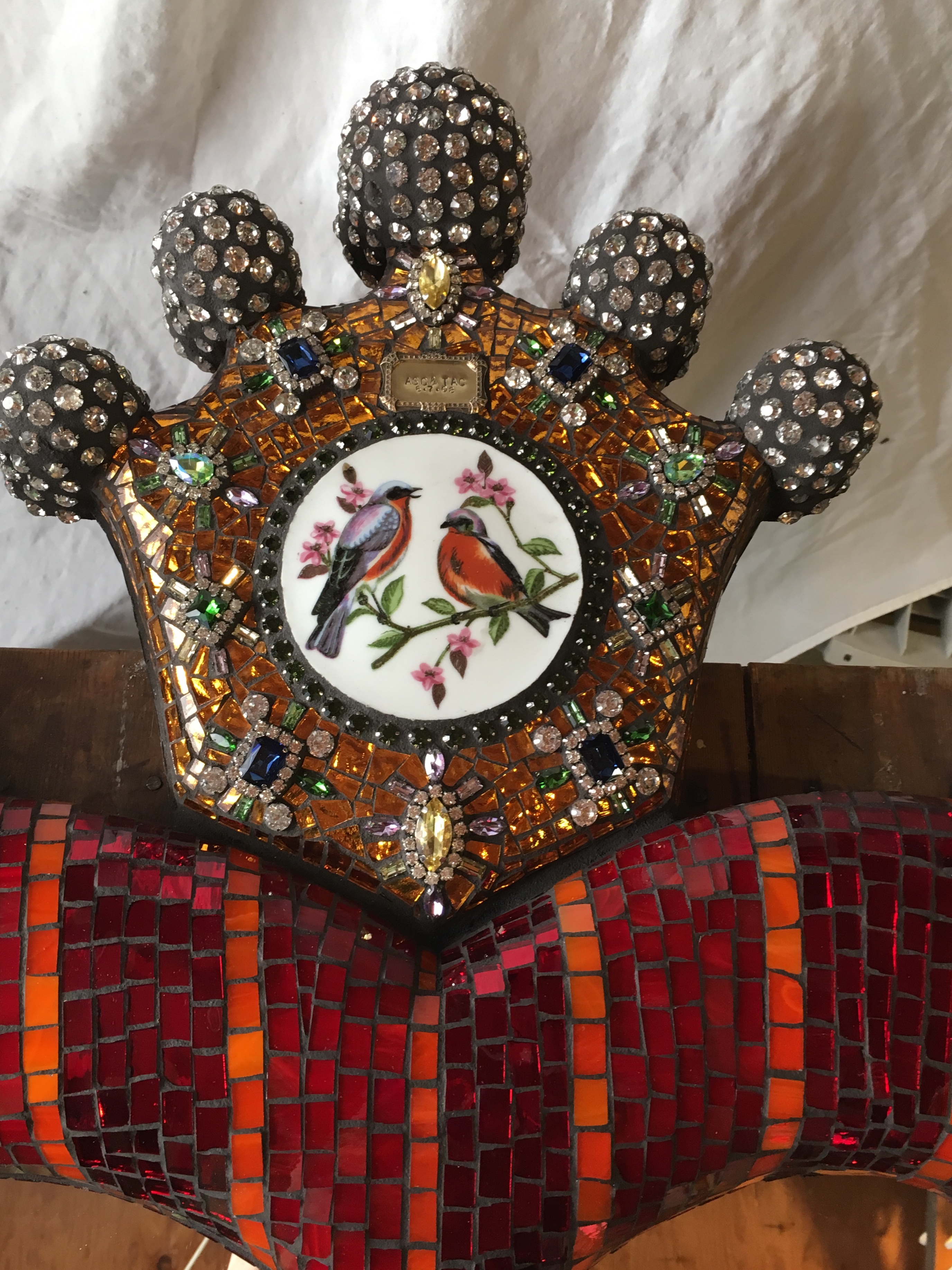 Closeup of jeweled crown from heart mirror that was commissioned for clients’ 10th wedding anniversary.