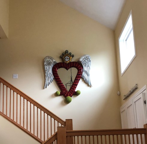 Private commissioned heart mirror w/ silver wings and jeweled crown for clients 10th wedding anniversary. Completed March 2018 Dimensions: 48″W x 54″L x 6″H