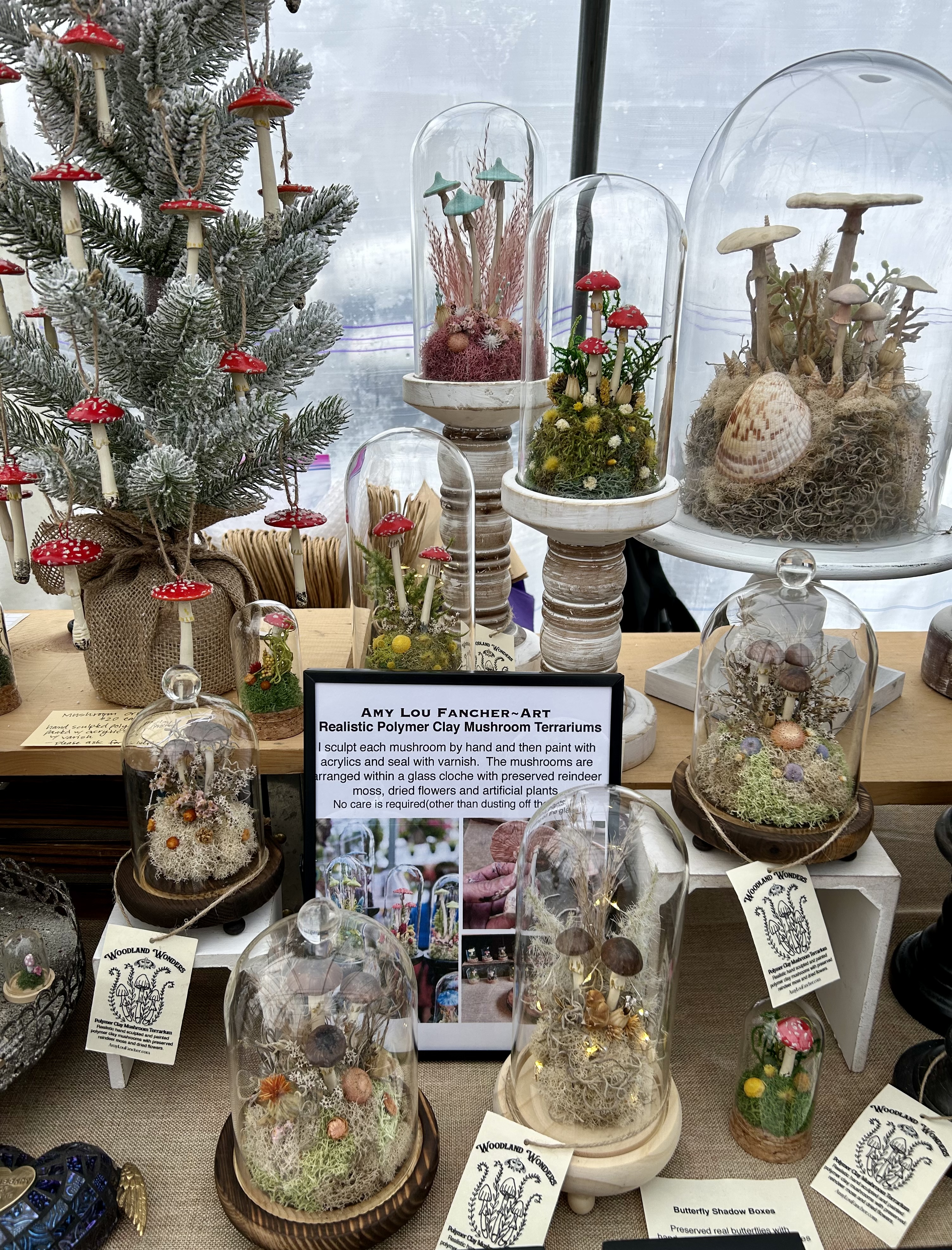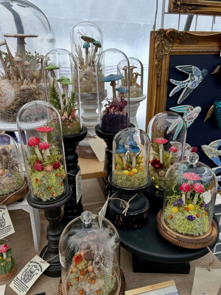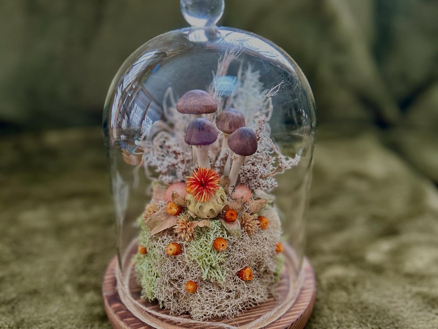 My latest creative adventure: polymer clay mushroom terrariums began in the summer of 2023 purely as an exercise in fun! It was so much fun that I decided to keep making more…and so Woodland Wonders was established in 2024 and is inspired by the beauty and mystery of the forest and all of the flora and fauna within it. Each terrarium and shadowbox is created with love and attention to detail. I hand sculpt the polymer clay into mushrooms and then paint with acrylics and finish with sealant. Each terrarium features preserved reindeer moss and a mixture of dried flowers and artificial ferns and plants all safely housed under a glass cloche. Available for purchase in my Etsy Shop.