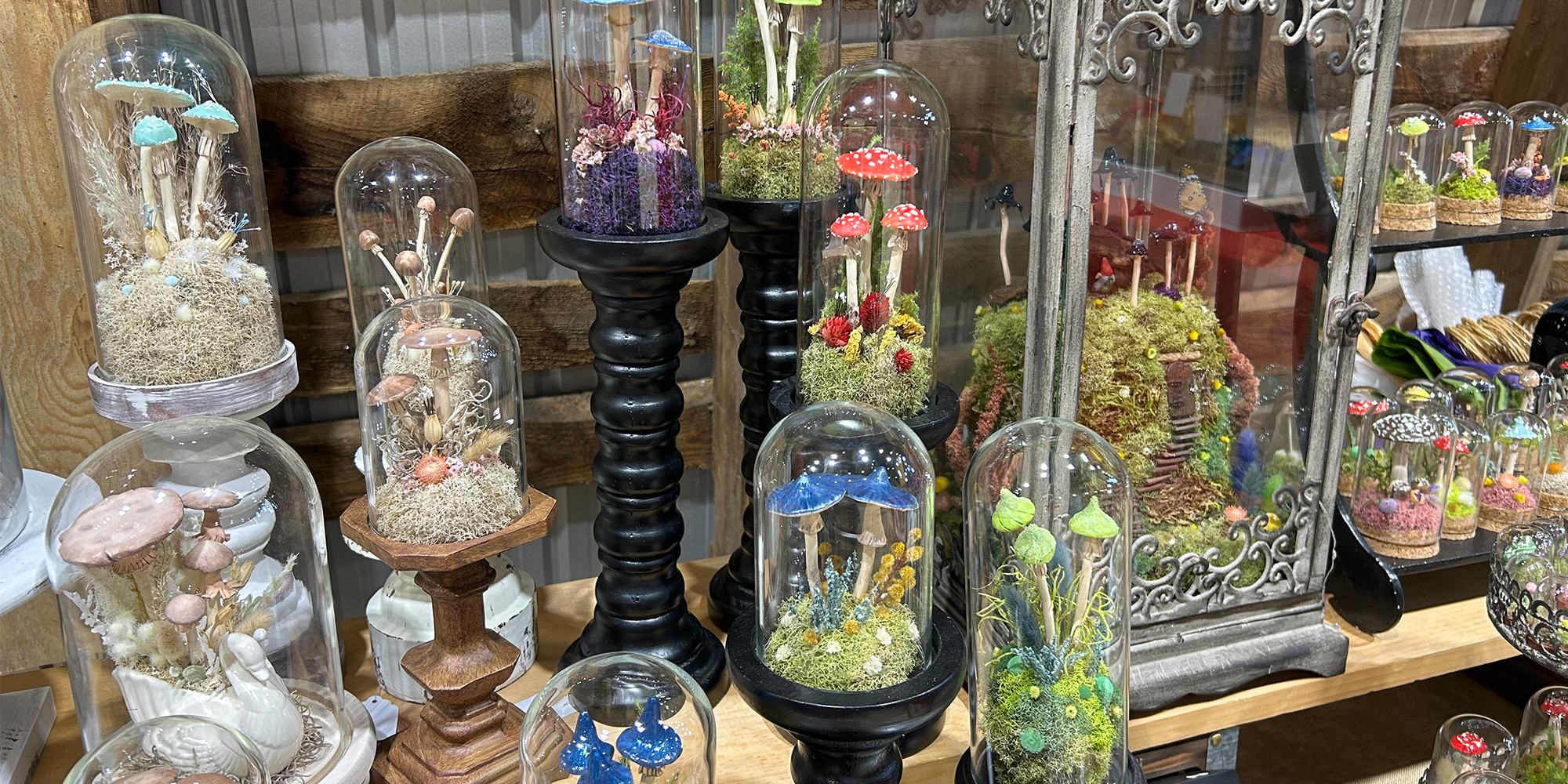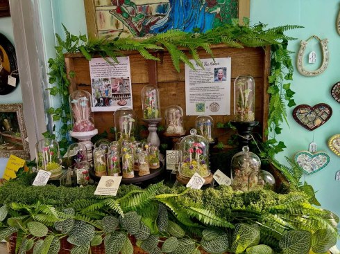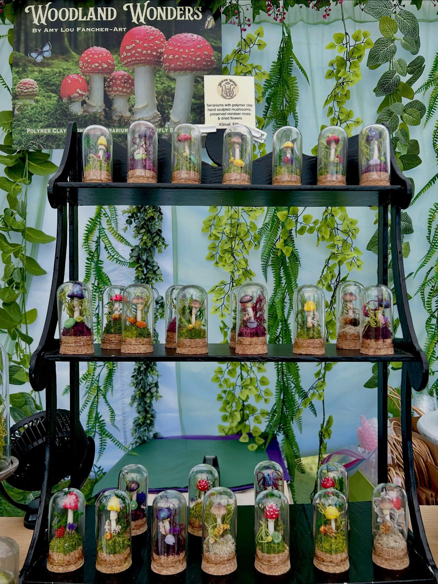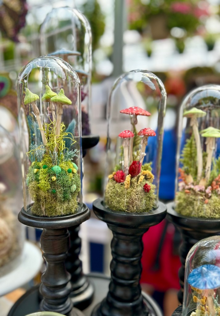 My latest creative adventure: polymer clay mushroom terrariums began in the summer of 2023 purely as an exercise in fun! It was so much fun that I decided to keep making more…and so Woodland Wonders was established in 2024 and is inspired by the beauty and mystery of the forest and all of the flora and fauna within it. Each terrarium and shadowbox is created with love and attention to detail. I hand sculpt the polymer clay into mushrooms and then paint with acrylics and finish with sealant. Each terrarium features preserved reindeer moss and a mixture of dried flowers and artificial ferns and plants all safely housed under a glass cloche. Available for purchase in my Etsy Shop.
